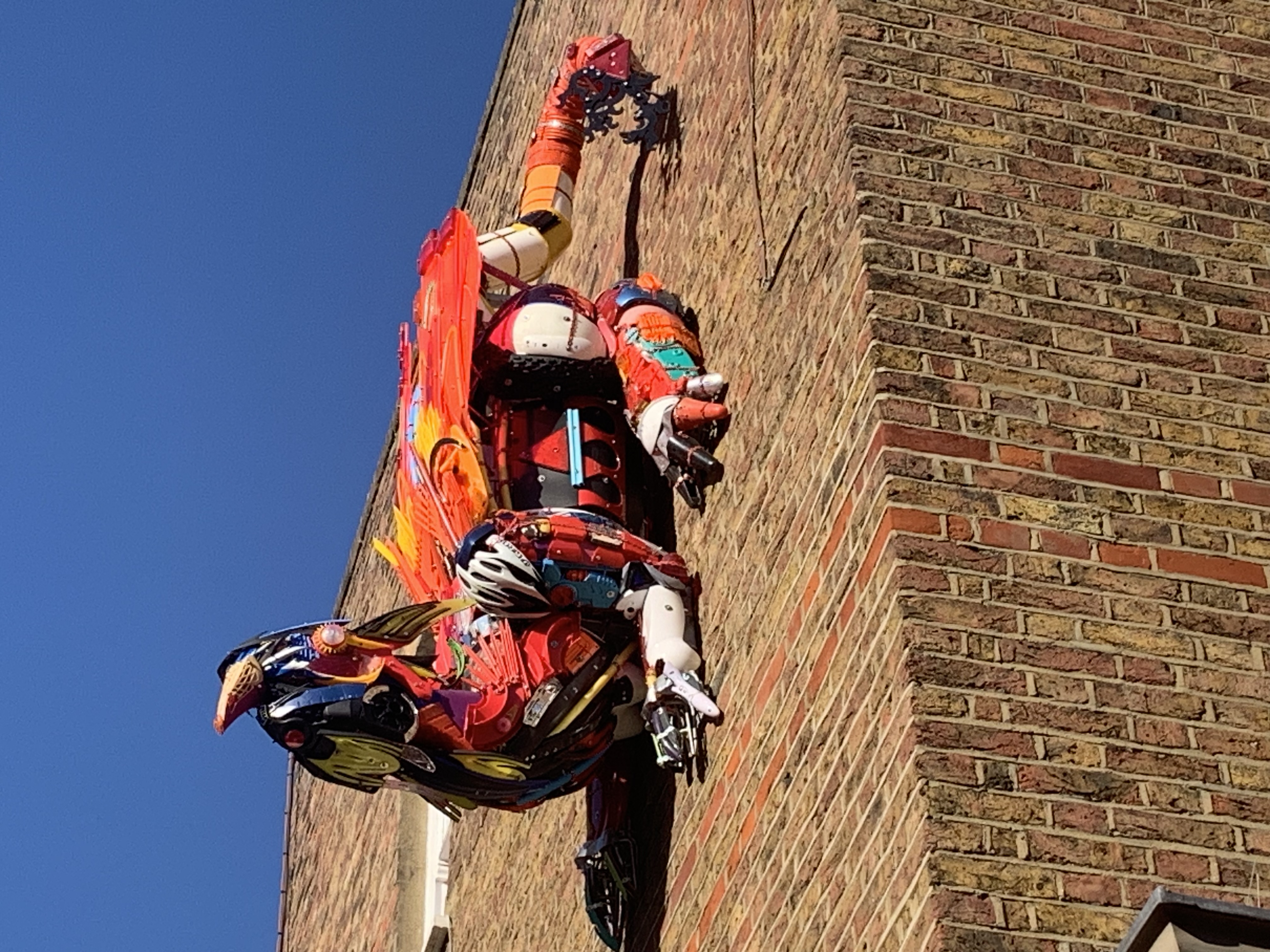 In the sculpture I tried to capture this playful, dynamic, but extremely meaningful movement from the point of view of the flaunting male virtue. The slender wire figure somehow steered me in this direction. Holding in my hands, I saw a young man in it. During the design process, the moustache, hat, and waistcoat gained prominence as integral parts of the Hungarian national costume, but already adapted from the pages of the ‘golden pages’ in Southend. Just to keep our lad local and current. The base of the statue is a piece of a cutting board that I got from my parents’ house as a guide. It got broken, but mostly because of the emotional ties I would have regretted throwing it away.