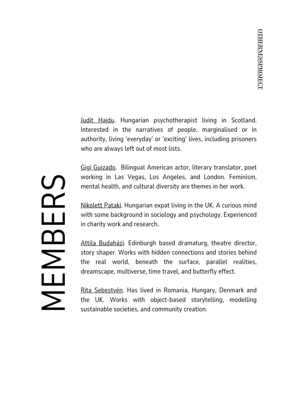 Otherness Project was initiated as a third sector organisation in Helsingør, Denmark, in 2014, with a core group of artists and researchers residing in Eastern European and Nordic countries.