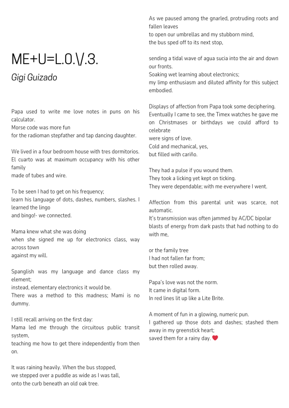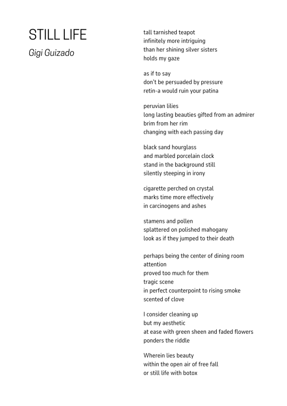 Gigi Guizado. Bilingual American actor, literary translator, poet working in Las Vegas, Los Angeles, and London. Feminism, mental health, and cultural diversity are themes in her work.