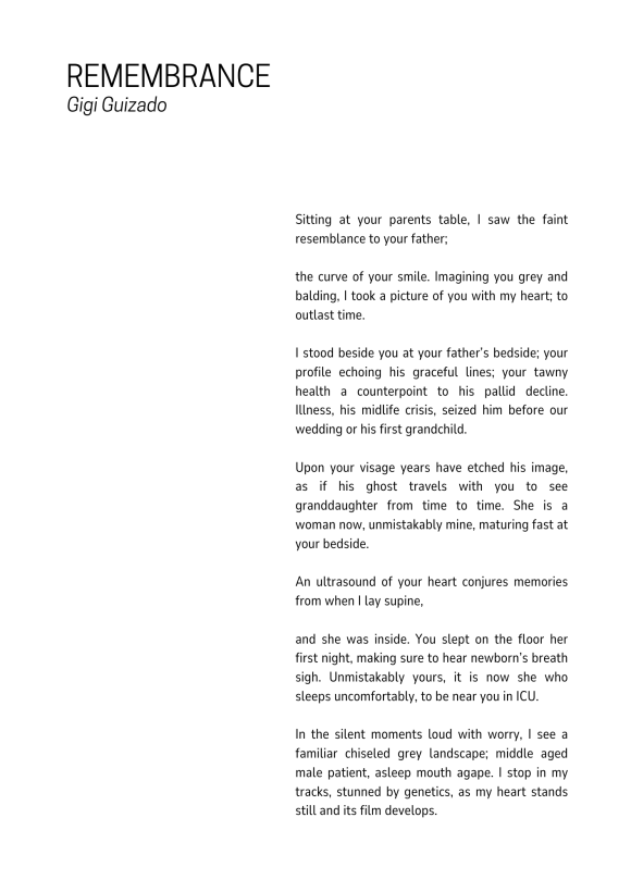 Upon your visage years have etched his image, as if his ghost travels with you to see granddaughter from time to time. She is a woman now, unmistakably mine, maturing fast at your bedside.